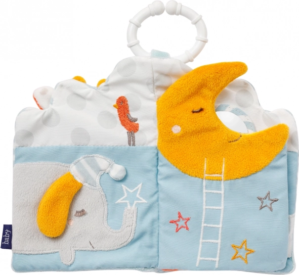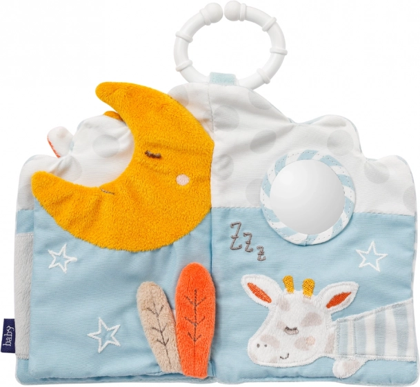 Hebká látková knížka pro nejmenší od 0+ měsíců podporuje smyslové vnímání a jemnou motoriku. Nabízí šustící papír, pískací hračku, zrcátko a svítící prvky, které zklidní dítě ve tmě. Díky praktickému poutku ji snadno připevníte na kočárek, autosedačku či postýlku.