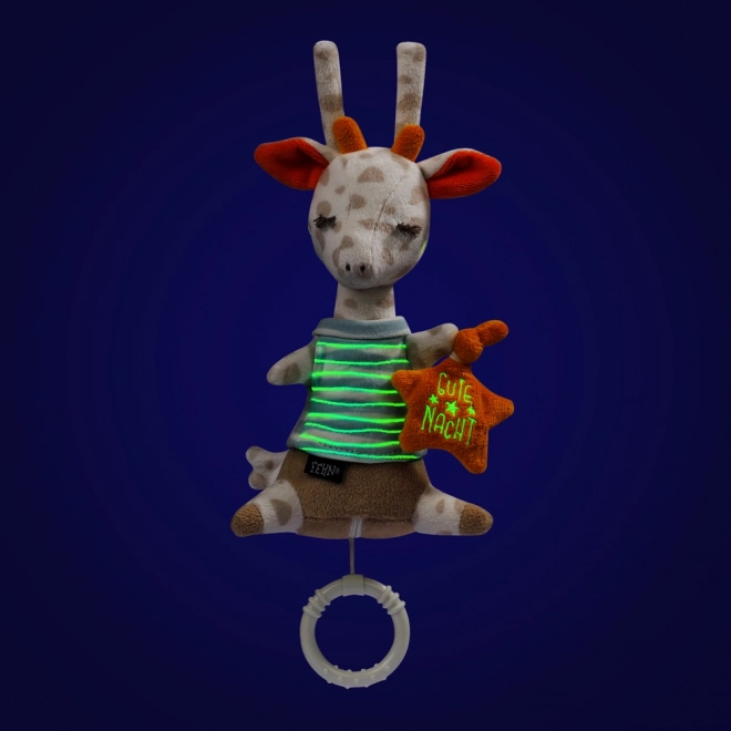 Hrací plyšová žirafa GoodNight je navržena pro nejmenší děti a stane se jejich věrným společníkem už od narození. Jemný velurový a žerzejový materiál je příjemný na dotek, zatímco uklidňující melodie a světelné body podporují pohodové usínání i noční klid.