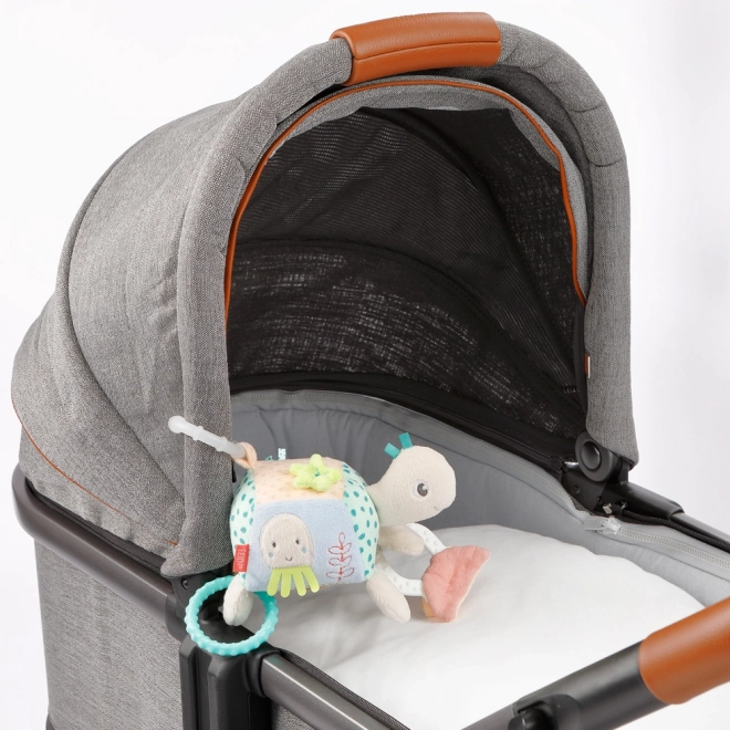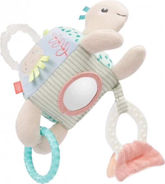 Interaktivní želvička s měkkým tělíčkem a různorodými texturami (velur, potištěná tkanina, buklé a síťovina) nabízí miminkům bezpečné objevování světa. Zabaví, uklidní a zároveň podporuje smyslové vnímání – od hmatových vjemů po vizuální stimulaci díky integrovanému zrcátku.