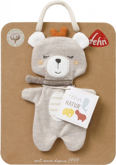 Pletený medvídek FEHN Natur z organické bavlny se šustícím efektem. Měkký, lehký a ideální pro rozvoj sluchu, hmatu a jemné motoriky miminka.