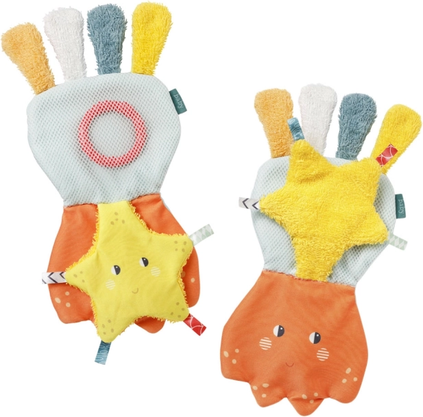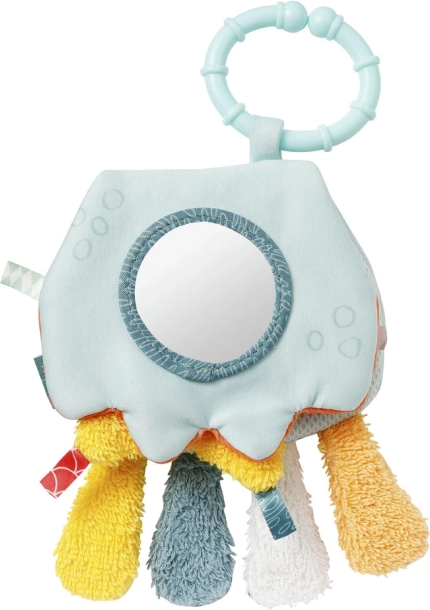 Skryté chrastítko, šustící papír a bezpečné zrcátko stimulují zrak, sluch i hmat. Dítě trénuje úchop a koordinaci pohybů během hry.