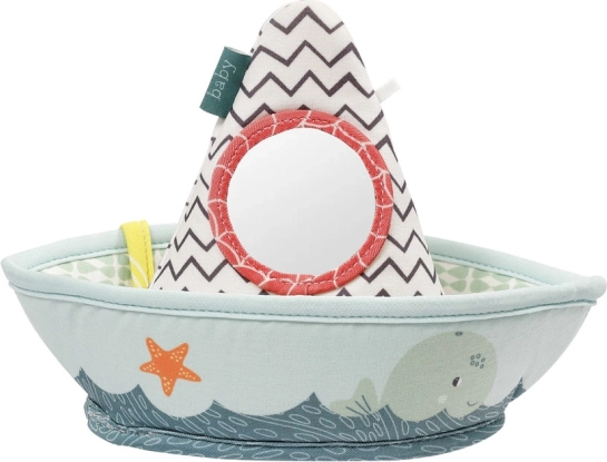 Koupací loď Splash Play promění každé koupání v malou dobrodružnou plavbu. Plovoucí textilní loďka s hravými motivy má v plachtě zrcátko a uvnitř šustící prvek, které dítě motivují k objevování a rozvíjejí zrakové, hmatové i sluchové vnímání. Měkký froté materiál je příjemný na dotek a šetrný k dětské pokožce.