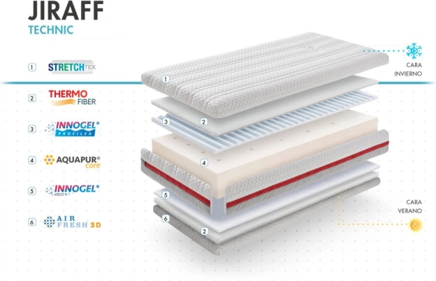 Vrstvy Profiled INNOGEL® a Visco INNOGEL® rozkládají tlak, poskytují adaptivní oporu a díky gelovým částicím zpomalují absorpci tepla. Polstrování Thermo Fiber přidává měkkost a zvyšuje přizpůsobivost. Elastický prodyšný potah Stretch usnadňuje pohyb miminka během spánku a lze jej jednoduše sejmout pro snadnou údržbu.