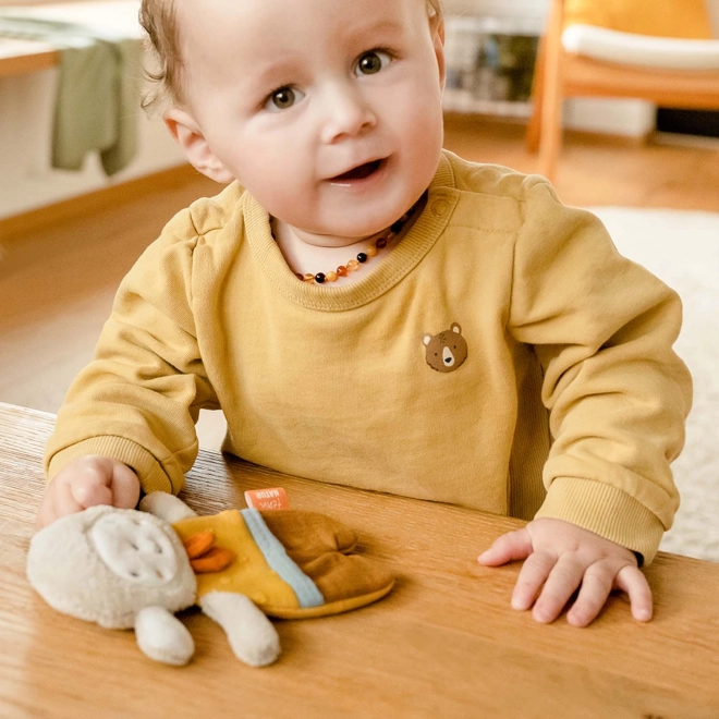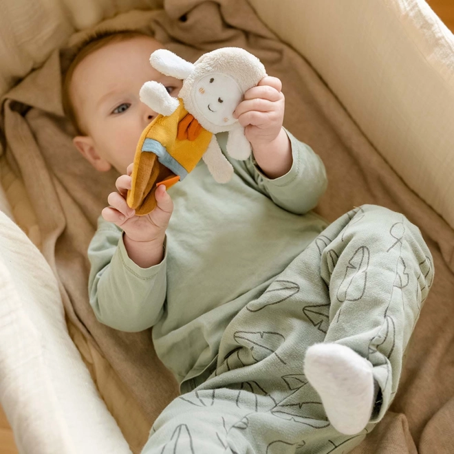 Tato hebká plyšová hračka ve tvaru ovečky je navržená pro nejmenší. Vydává jemné praskací zvuky, které děťátko zaujmou, a podporuje smyslové vnímání – zrak, sluch, hmat i úchop. Díky kompaktní velikosti si ji snadno vezmete kamkoliv s sebou.