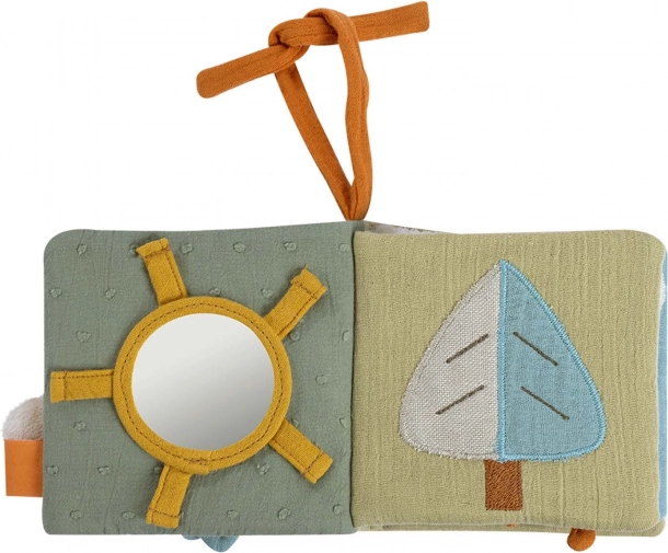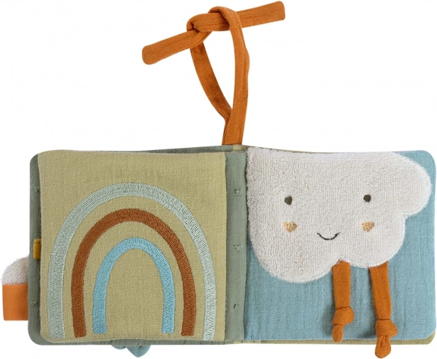 Tato přátelská látková knížka s motivy ovečky, slunce, stromu, duhy, mráčku, měsíce a domečku je navržena pro nejmenší průzkumníky. Různorodé materiály – žerzej, mušelín, froté a velur – lákají k prozkoumávání a posilují jemnou motoriku. Integrované prvky jako šusticí papír, pískátko a zrcátko podporují smyslový rozvoj a sebeuvědomění.