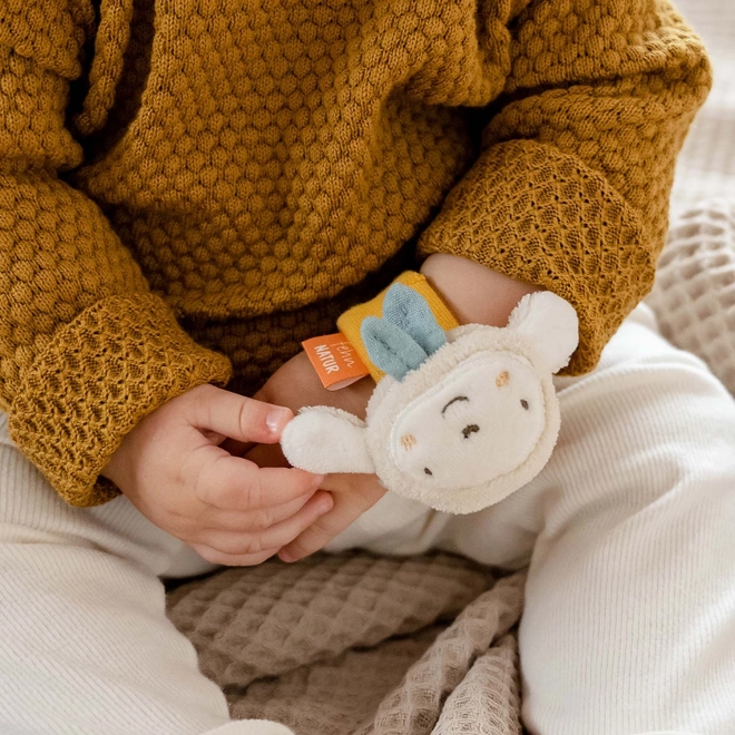 Náramek při každém pohybu ručičky příjemně zachrastí a přirozeně povzbuzuje miminko k aktivnímu objevování a posilování jemné motoriky.
