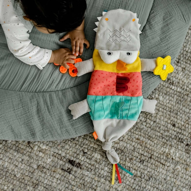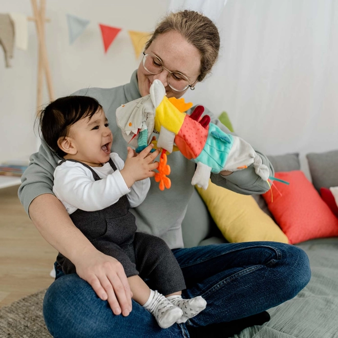 Tento interaktivní maňásek krokodýla přináší dětem zábavu i smyslovou stimulaci v jednom. Pestré barvy, různé textury a zvukové efekty probouzejí zvědavost a pomáhají rozvíjet koordinaci oko–ruka. Měkká kousátka ulevují při prořezávání zoubků, zatímco chrastítko a praskací papír motivují k objevování a soustředění.