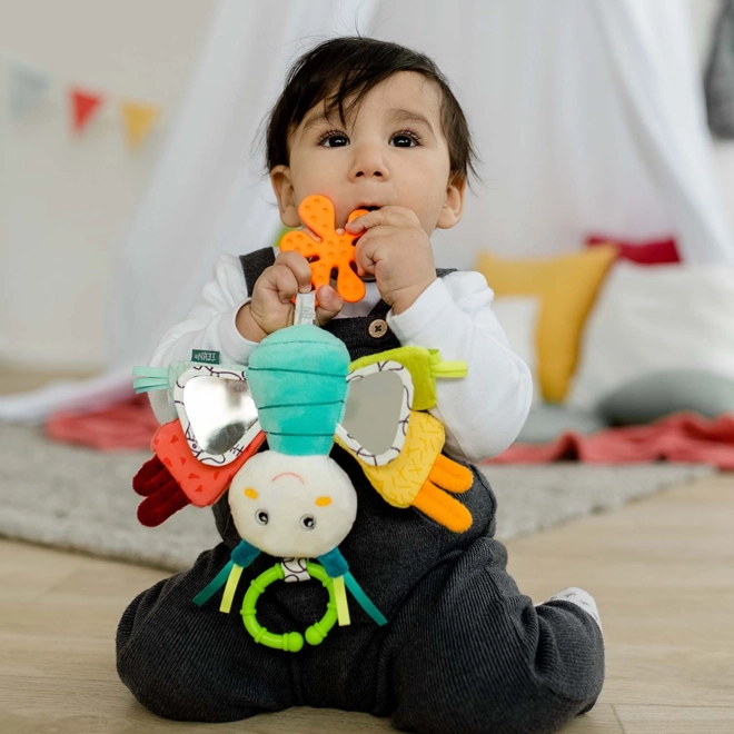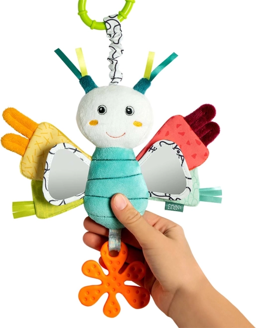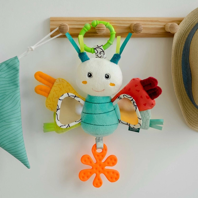 Tento barevný plyšový motýl podporuje zrak, hmat, sluch i jemnou motoriku. Miminko zaujmou šustící křidélka, zábavné zvuky a bezpečné zrcátko, ve kterém může objevovat svůj odraz. Měkké kousátko ve tvaru hvězdy přináší úlevu při prořezávání zoubků.