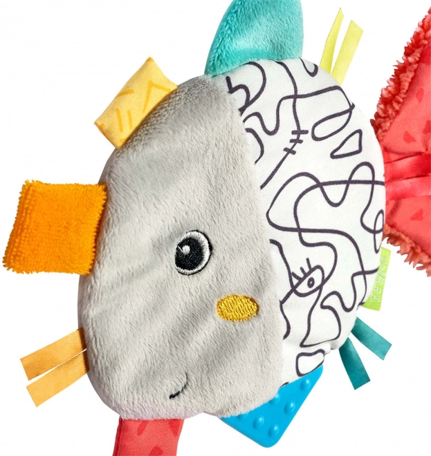 Tato smyslová hračka ve tvaru rybičky je navržená pro malé ručky a velkou zvídavost. Různé povrchy (samet, měkký plyš, potištěná látka a froté) lákají k objevování, zatímco praskací papír a jemné chrastění přirozeně podněcují sluch. Integrované kousátko přináší úlevu při prořezávání zoubků.