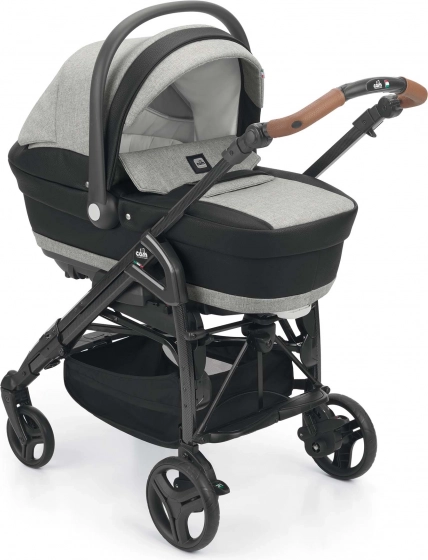 Hluboká korba s texturovanou tkaninou a detaily z eko kůže. Po vyklopení vzpěr ji proměníte v pohodlnou kolébku, ideální pro uklidnění miminka.