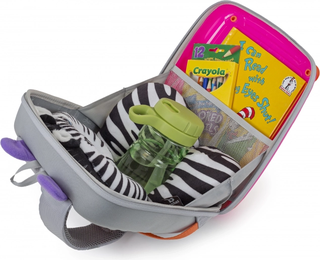 Hlavní kapsa pojme svačinu, knížky i hračky. Síťovaná přihrádka udrží drobnosti přehledně oddělené a kvalitní zipy vše bezpečně uzavřou.