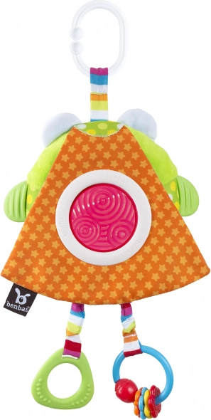Roztomilá závěsná hračka ve tvaru žabky potěší miminka od narození. Kombinuje světlé barvy, chrastítko v bříšku, šustivé prvky a různorodé textury pro smyslové vnímání. Díky snadno upevnitelnému klipu ji přichytíte na kočárek či autosedačku. Bez BPA.