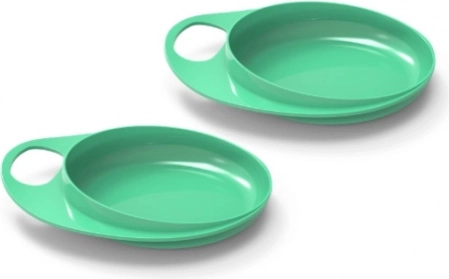 Praktická sada dvou talířků v odstínu pastelově zelené s vyvýšeným okrajem podporuje samostatnost u jídla a usnadňuje manipulaci. Díky ergonomickému kroužku se talířek snadno drží a nese, zatímco zvýšený okraj pomáhá udržet jídlo na místě a zabraňuje kontaktu ruky s pokrmem. Ideální pro děti i každodenní použití v domácnosti.