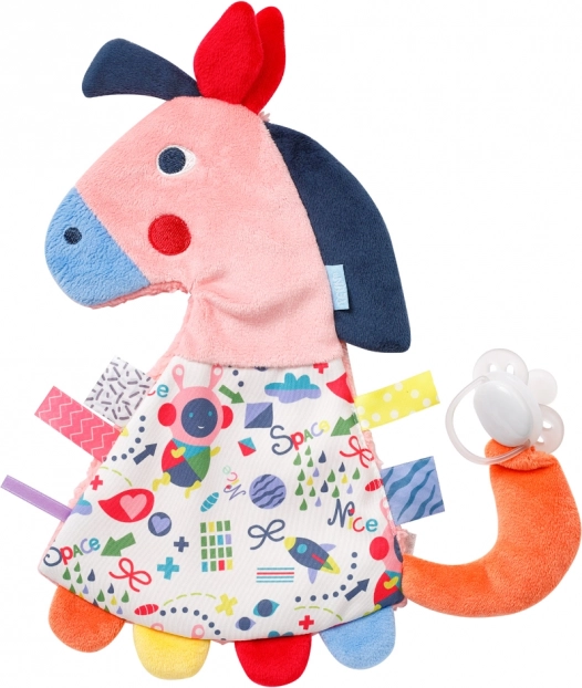 Roztomilý muchláček ve tvaru koníka z kolekce Color Friends je ideální první kamarád pro miminka. Kombinace měkkých materiálů, různorodých textur a šustivého zvuku podporuje smyslový rozvoj a vědomé uchopování. Lehký a skladný muchláček je skvělý na mazlení, objevování i uklidnění, a díky praktickému upevňovacímu kroužku ho snadno připevníte na kočárek či autosedačku.