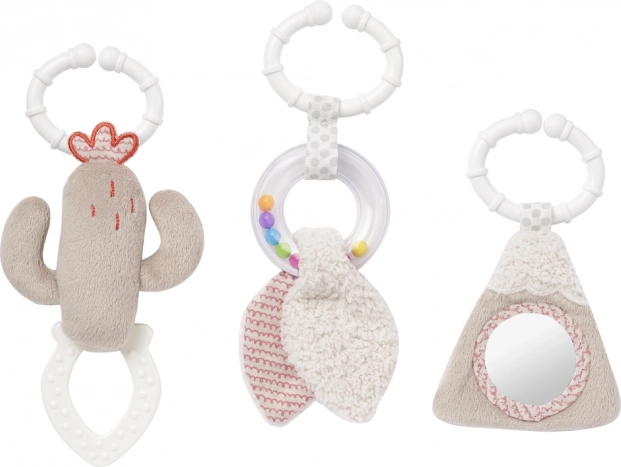 Tři přívěsky s mořskými motivy se zrcátkem, pískátkem, chrastítkem a šustícím papírem podporují smyslové vnímání a jemnou motoriku.