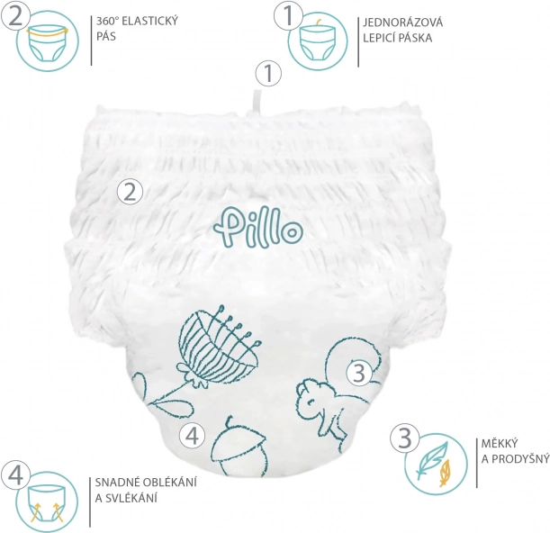 Pleny jsou ultra jemné a prodyšné, takže pokožka může dýchat po celý den. Super pružný pas se dokonale přizpůsobí pohybu dítěte, což oceníte při hraní i během spánku. Díky kalhotkovému střihu je přebalování rychlé a snadné – ideální pro aktivní děti.
