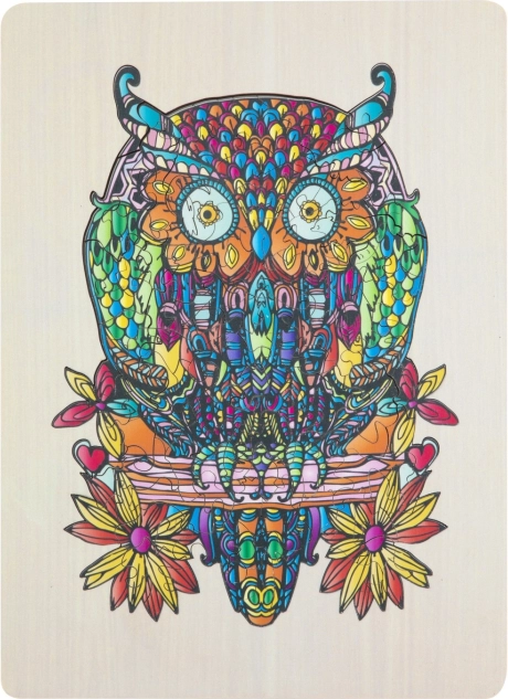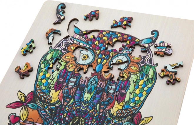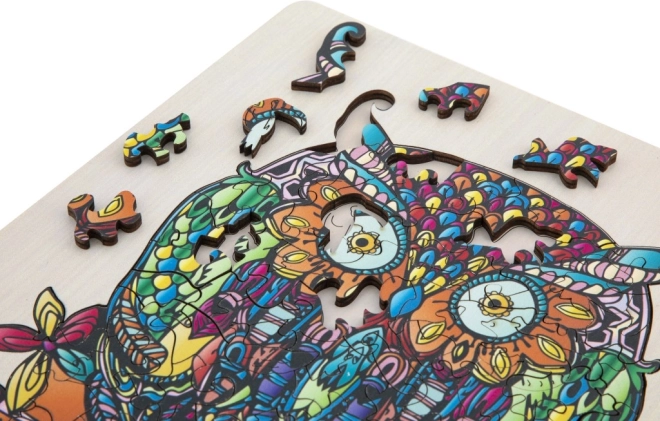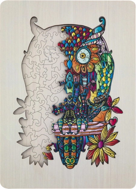 Dřevěné obrysové puzzle s motivem sovy je zábavná hračka pro děti i dospělé. Obsahuje 133 různě tvarovaných dílků a podkladovou desku pro snadnější skládání.
