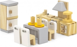 Sada obsahuje lednici, dvě kuchyňské skříňky, sporák, stůl, čtyři židle a menší kuchyňské doplňky.
