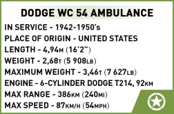 Tato realistická stavebnice modelu Dodges WC 54 umožňuje znovu vytvořit kus historie s autentickými detaily. Model je v měřítku 1:35 a díky licenci RAM TRUCKS nabízí vysokou kvalitu a přesnost. Se svými 293 kostkami a figurkou jsou ideální nejen pro stavitele, ale i pro milovníky vojenské historie.