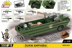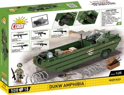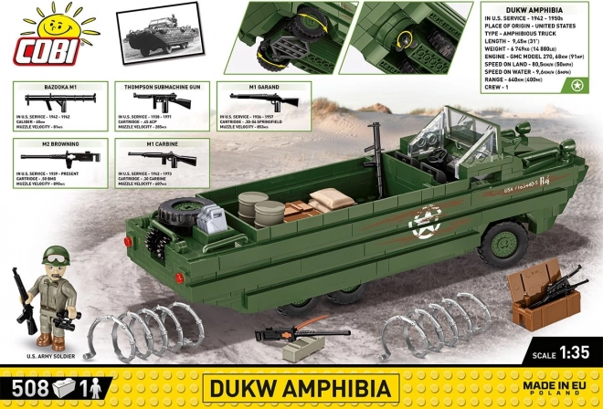Stavebnice Amfibií DUKW je navržena pro milovníky historie a vojenské techniky. Model je vyroben v měřítku 1:35 a zdobí ho oficiální logo oslav 80. výročí vylodění Spojenců v Normandii. Přináší realistické prvky, jako jsou otočná kola a americký voják s množstvím příslušenství, včetně bazuky, pušky Browning, Garand, Thomson a M1. V nákladním prostoru naleznete bedny, sudy, kanystry a náhradní kolo.