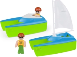 Sada plachetnic Katamarán Lena pro zábavnou hru u vody. Obsahuje plachetnici a katamarán s plachtou a dvě figurky surfařů.