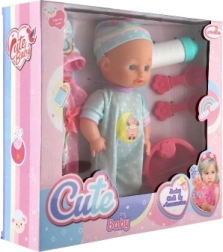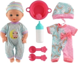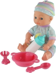V balení najdete kompletní jídelní set s lahvičkou, miskou, lžičkou a vidličkou i obleček navíc pro převlékání. Hra s panenkou rozvíjí jemnou motoriku, fantazii a učí děti zodpovědnosti zábavnou formou.
