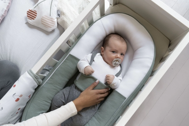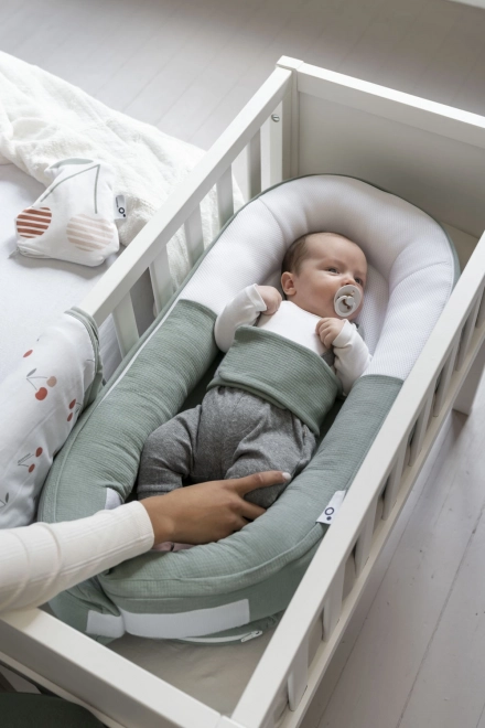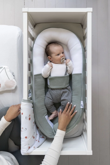 Odnímatelný bezpečnostní pás udržuje dítě ve správné poloze na zádech, zatímco rozepínatelná spodní část umožní používat hnízdečko od narození až přibližně do 8 měsíců. Kombinace organické bavlny, elastanu a měkké výplně poskytuje jemný dotyk a pohodlí při každodenním používání.