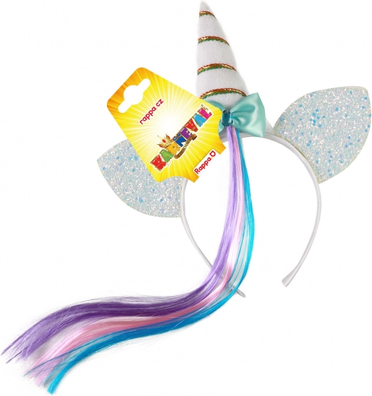 Design kombinuje bílé provedení s lesklými stříbrnými oušky, výrazným jednorožčím rohem a duhovým pramínkem, který dodá účesu kouzelný efekt. Ozdobná mašle podtrhuje jemný vzhled a zvýrazňuje tématický kostým.