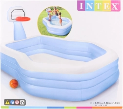 Hrací centrum s integrovaným basketbalovým košem a míčem nabízí skvělou kombinaci vodních radovánek a pohybové aktivity. Prostorné rozměry 257 × 188 × 130 cm a objem 682 l (při výšce hladiny 32 cm) zajistí dostatek místa pro děti od 3 let.