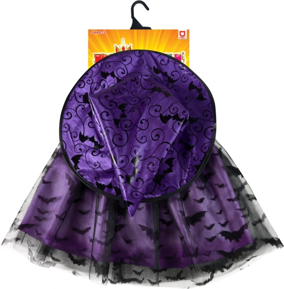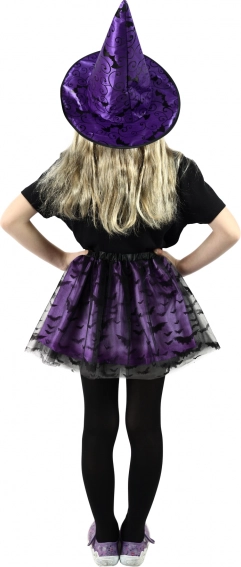 Tento dětský kostým čarodějnice zaujme hravým designem a pohodlným nošením. Lehounká tutu sukně s potiskem netopýrů má přibližnou délku 30 cm a díky pružné gumičce v pase se snadno přizpůsobí postavě. Součástí setu je i špičatý klobouk ve stejném stylu, který doladí kouzelný vzhled.