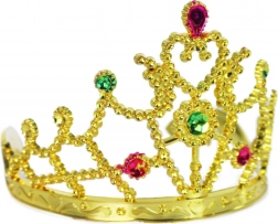 Zlatá tiara je posázena různobarevnými kameny, mezi nimiž vynikají zelený a červený. Tato tiara dodává každému outfitu nádech královského vzhledu.