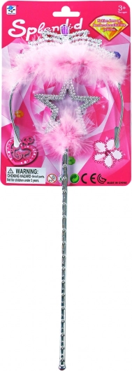 Exkluzivní sada pro princezny! Tato stylová souprava obsahuje oslnivou korunku s barevnými kamínky a žezlo, dekorované ozdobným peřím růžové barvy. Obohať svůj kostým o tyto nádherné doplňky.