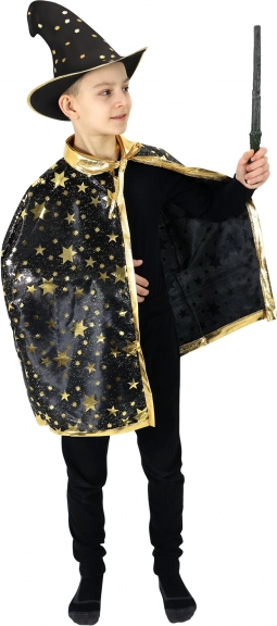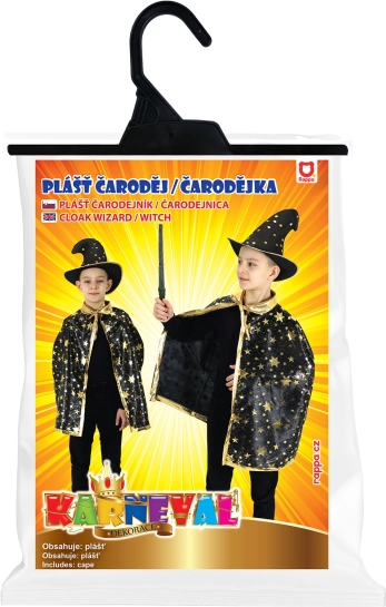 Kontrastní černý plášť se zlatým lemováním a hvězdami vytváří výrazný, okouzlující vzhled pro malé kouzelníky a čarodějky.