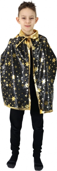 Stylový dětský kouzelnický plášť s hvězdami promění každé dítě v malého čaroděje či čarodějnici. Plášť se pohodlně zavazuje u krku a zdobí ho zlaté hvězdičky a lesklé lemování, které vytváří magický vzhled. Skvělý pro karneval, Halloween, divadelní vystoupení i hraní na kouzla doma. Vhodné pro děti cca 3–10 let (výška 104–150 cm).