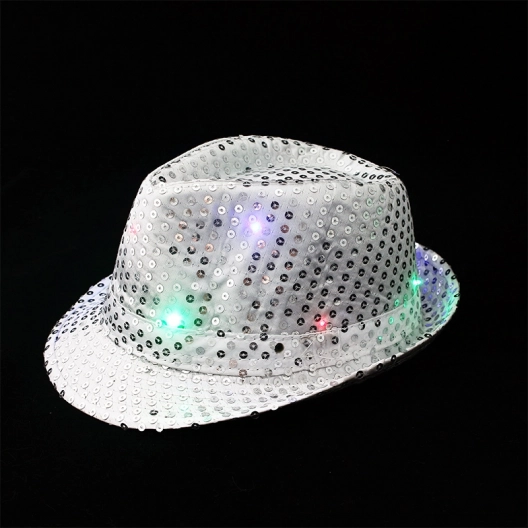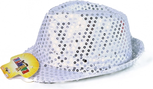 Rozjeďte každou párty s tímto stylovým stříbrným disco kloboukem! Flitrový povrch a barevně blikající LED osvětlení se třemi režimy z něj dělají nepřehlédnutelný doplněk. Ovládání je snadné díky nenápadnému tlačítku na boku a součástí balení jsou 3 baterie LR44.