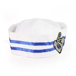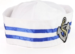 Dodejte dětskému kostýmu pravý nádech moře. Tato bílá námořnická čepice s modrými pruhy a ozdobnou kotvou je perfektním doplňkem pro malé mořeplavce. Lehký textilní materiál je příjemný na hlavě a dobře drží tvar.