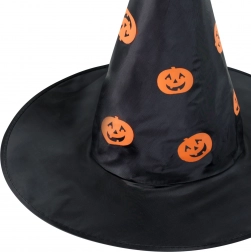 Stylový dětský čarodějnický klobouk v černé barvě s potiskem oranžových dýní pro dokonalý halloweenský kostým. Ideální na karneval, večírky a tematické akce. Nabízí pohodlné nošení a výrazný vzhled pro malé kouzelníky a čarodějnice. Halloween, čarodějnický klobouk, dýně, kostým pro děti.