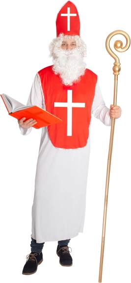 Tento mikulášský kostým pro dospělé tvoří dlouhé bílé roucho (cca 145 cm od ramen) a červená náprsenka s výrazným bílým křížem. Součástí je také čepice se zapínáním na suchý zip pro rychlé a bezpečné upevnění. Díky univerzálnímu střihu se kostým pohodlně nosí a snadno vrství.