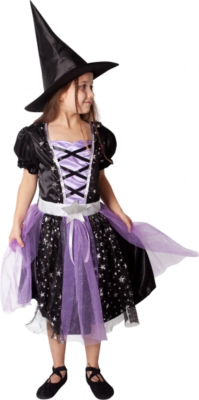 Černo‑fialové šaty zdobené stříbrnými hvězdičkami zaručí, že bude vaše malá čarodějka středem pozornosti na každé párty.