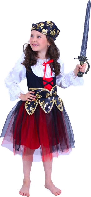 Staň se pirátkou, která má styl! Tento krásný saténový kostým s tylovou sukní je ozdoben páskem se zlatým potiskem s motivem lebek. Aby byl kostým kompletní, obsahuje šátek na hlavu ve stejném designu. Tento kostým ve velikosti M je vhodný pro děvčata ve věkovém rozmezí 6-8 let (116-128cm). Nejen letos je potřeba myslet EKO-nomicky i EKO-logicky! EKO-balení je vhodné zejména pro e-shopy kde zákazník nakupuje dle fotografie a není třeba velkého balení s věšákem. EKO-logicky – na balení bylo použito méně plastu a dalších materiálů. Jedná se o malý transparentní obal s fotografií. EKO-nomicky –EKO-obal zabere jen polovinu místa – šetřete skladová místa s námi!
