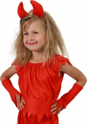 Šaty, pásek, návleky a čelenka s rohy – vše sladěné v červené barvě pro dokonalý kostým bez shánění doplňků.