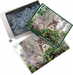 Detailní zobrazení dospělého výra a mláděte v zeleném porostu umocňuje atmosféru přírody a dělá z puzzle poutavý dekorativní obraz.
