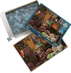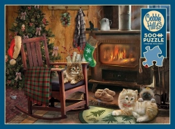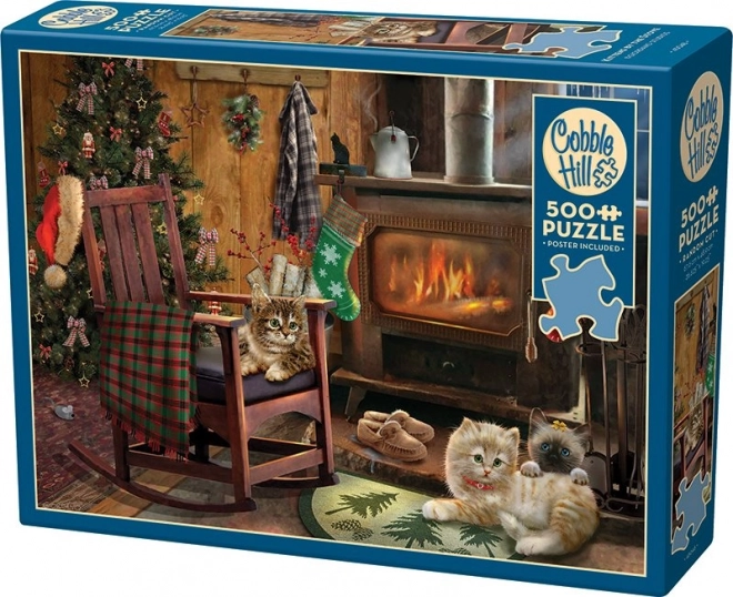 Puzzle zobrazuje vánoční scénu s koťaty u kamen, což je ideální pro vytvoření sváteční atmosféry doma.