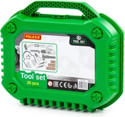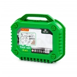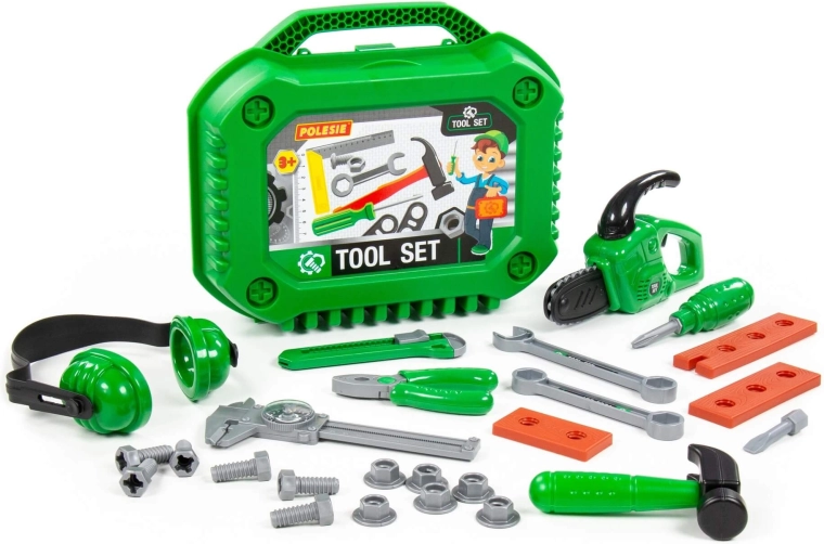 Obsah sady: řetězová pila (1 ks), stavební sluchátka, posuvné měřidlo, stavební nůž, kleště, kladivo, šroubovák s vyměnitelnými nástavci, otevřený klíč, stranový klíč, šrouby (6 ks), matice (6 ks), spojovací destičky a kufřík na nářadí.