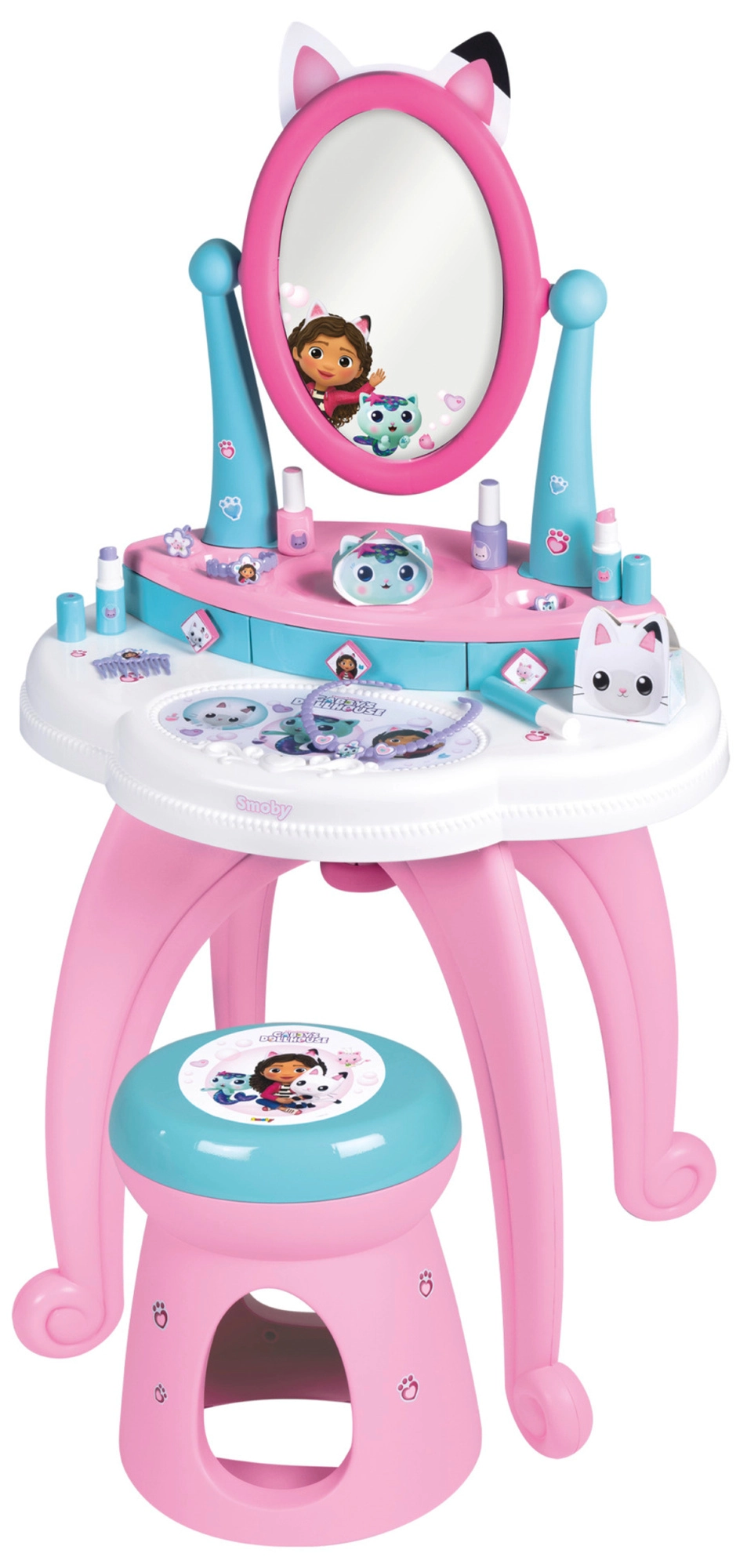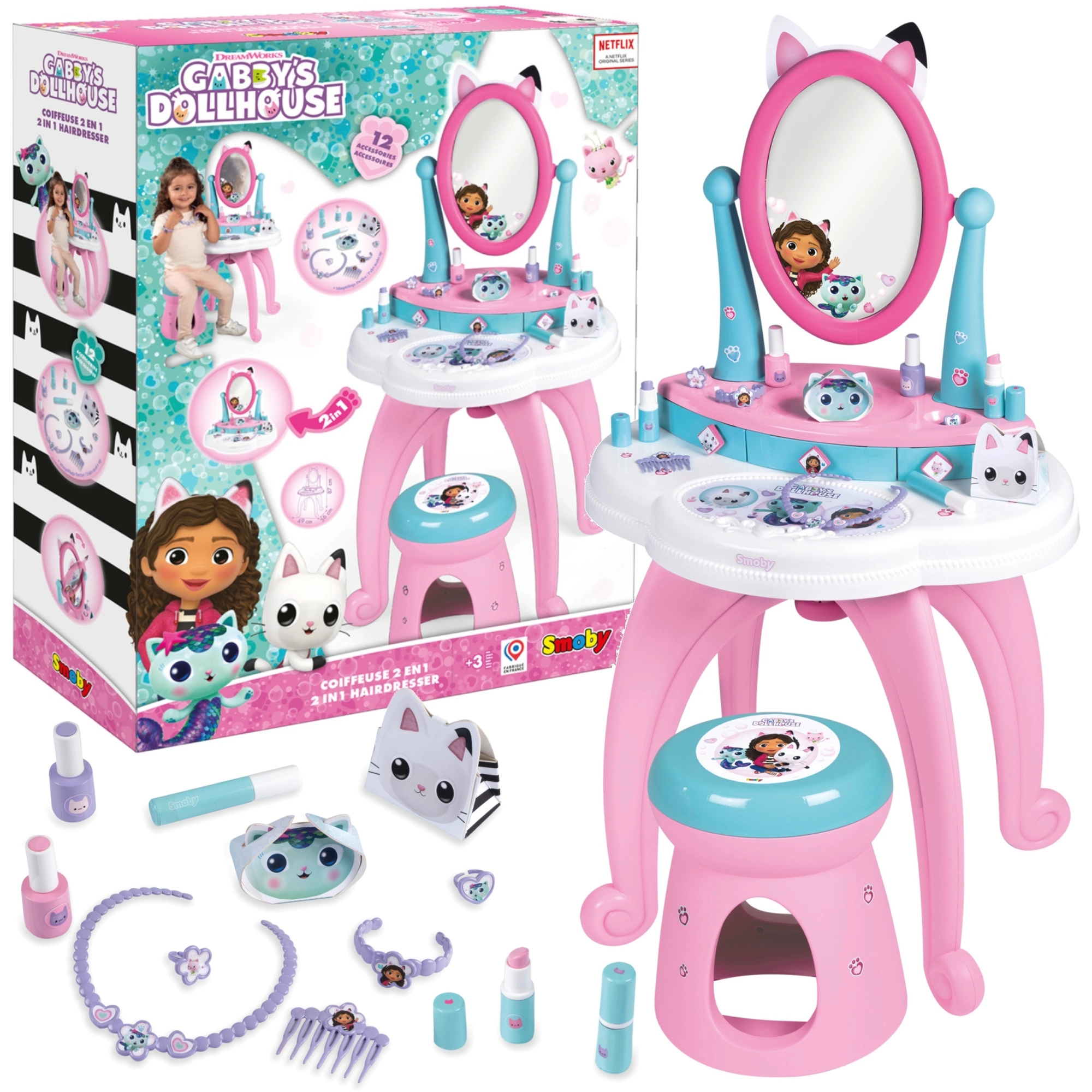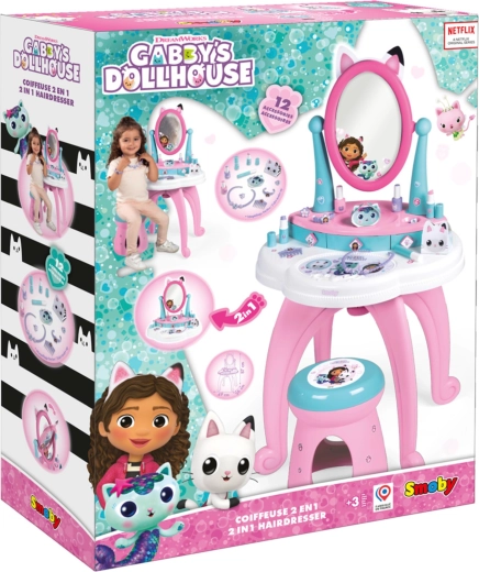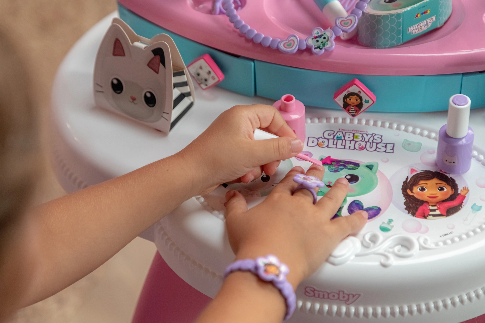 Vstupte do kouzelného světa GABBY’S DOLLHOUSE s dětským toaletním stolkem 3 v 1 od Smoby. Nabízí fénování, líčení i péči o nehty, má velké polohovatelné zrcadlo, 3 zásuvky a pohodlnou stoličku. V balení je 12 doplňků pro kreativní hru a rozvoj fantazie.
