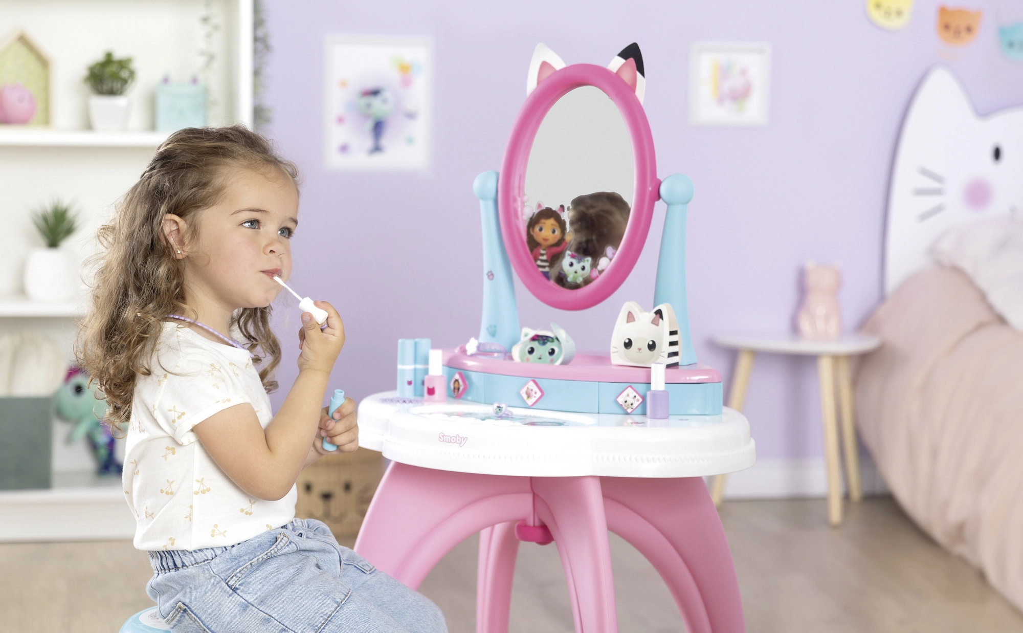 Toaletka pro děti inspirovaná oblíbeným seriálem GABBY’S DOLLHOUSE promění pokoj v malé kosmetické studio. Díky velkému nastavitelnému zrcadlu, třem zásuvkám a bohaté sadě doplňků je vše po ruce a hra působí realisticky a bezpečně.