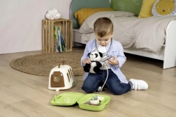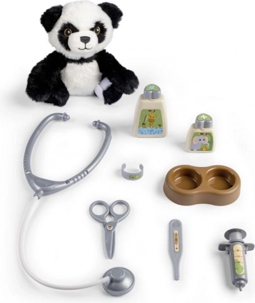 Stetoskop, injekční stříkačka, nůžky, miska na krmivo, náramek a dvě lahvičky – vše pro realistickou hru na veterináře. Včetně měkké plyšové pandy jako pacienta.
