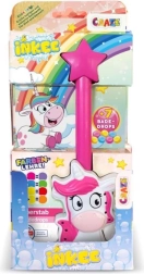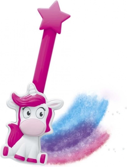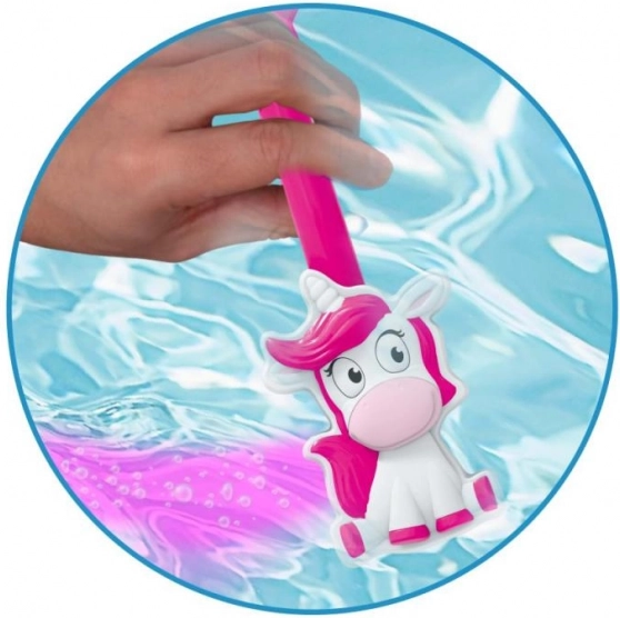 Vložte šumivou kapku do jednorožce a ponořte hůlku do vody – z hůlky se vyčaruje jasná barevná stopa, která promění koupel v kouzelný zážitek.