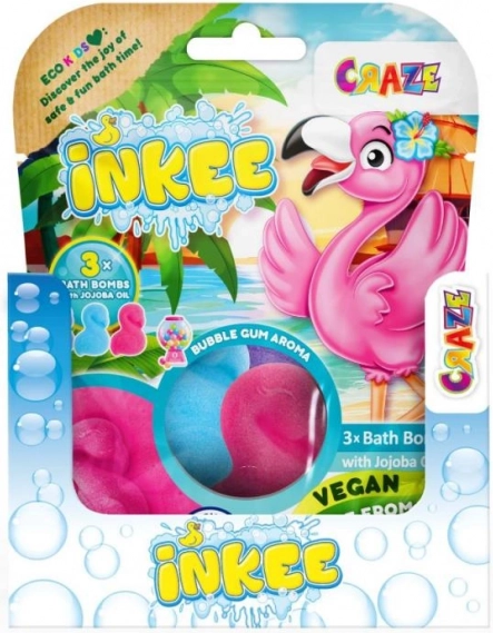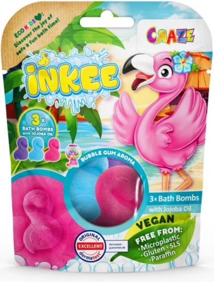 Zpříjemněte dětem i sobě koupel s hravými šumivými bombami INKEE ve tvaru plameňáka. V balení najdete tři barevné bomby (růžová, fialová, modrá) s vůní žvýkačky a pečujícím jojobovým olejem. Složení je vegan, bez mikroplastů, glutenu, SLS a parafínu a je navrženo tak, aby nekontrolovatelně nebarvilo vanu. Skvělé pro zábavnou, voňavou a šetrnou koupel.