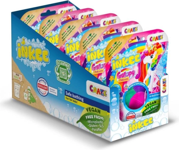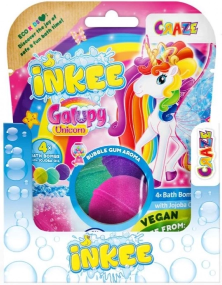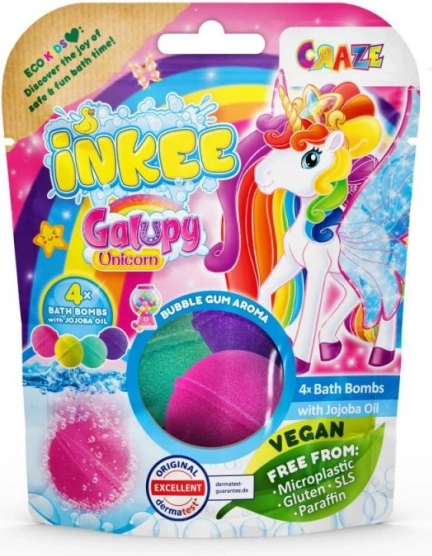 Přineste do dětské koupele radost a barvy s INKEE Galupy Unicorn. Každá bomba se ve vodě jemně šumí, uvolňuje zábavné barvy a sladkou vůni žvýkačky, zatímco jojobový olej pomáhá udržet pokožku hebkou.